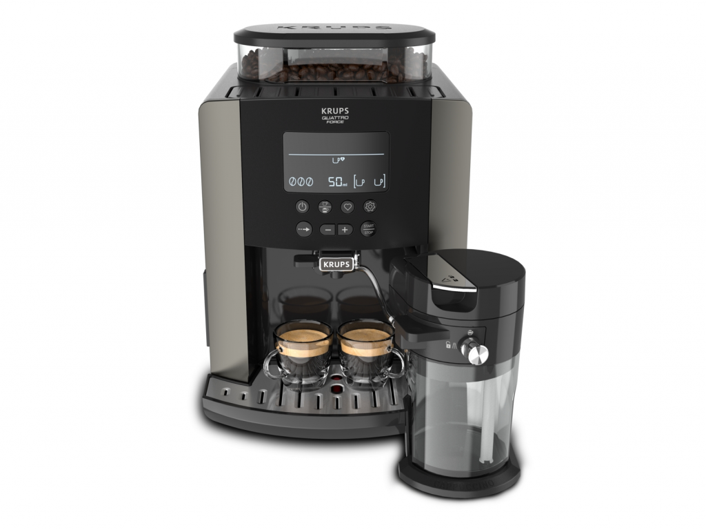 Krups Arabica Latte EA819E10,potpuno automatizirani kafe aparat, veliki LED display.Memorija 4 prilagodljiva recepta.Stainless steel mlin.Odvojivi spremnik za vodu i za kafu.Quatro Force sistem mljevenja.Brzo pokretanje do 30 sec.