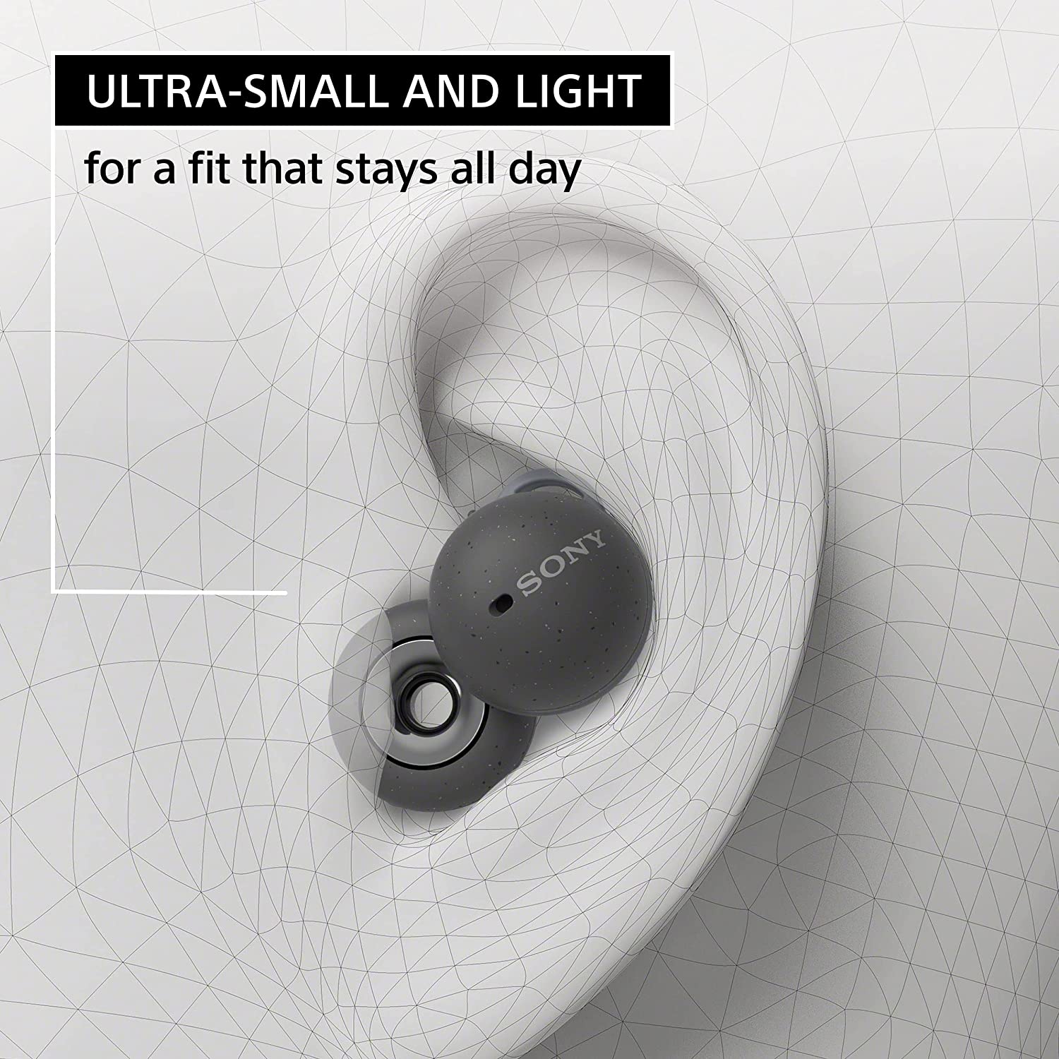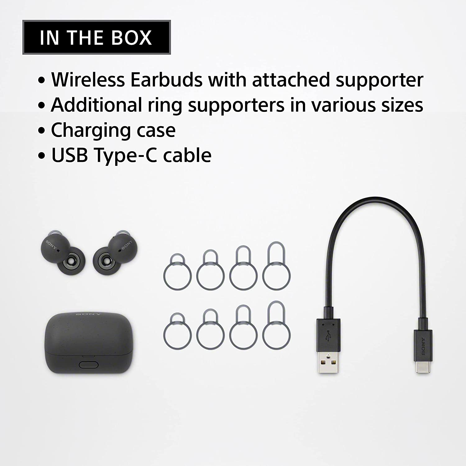 Sony LinkBuds True Wireless; dizajn s otvorenim prstenom s transparentnošću zvuka; tezina 34g; jasno čujte pozive i glazbu; Trajanje baterije od 5,5 h, ukupno 17,5 h s kućištem za punjenje; brzo punjenje; Otpornost na prskanje IPX4; boja crna